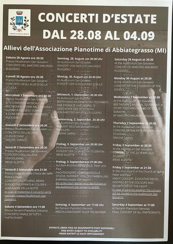 Dal 28 agosto al 4 settembre io e i miei ragazzi siamo al lago di Garda, nella splendida località Torri del Benaco ad animare le serate con la musica suonata dal vivo, ogni serata avrà un tema e una storia tutta sua, per concludere poi il 4 settembre a Verona con l’ultimo concerto del programma…. Inauguriamo un anno musicale con il massimo dell’entusiasmo e dedizione… nonostante tutto noi ci siamo sempre e la musica va oltre ogni cosa, oltre ogni tempo oltre ogni porta che non si apre.