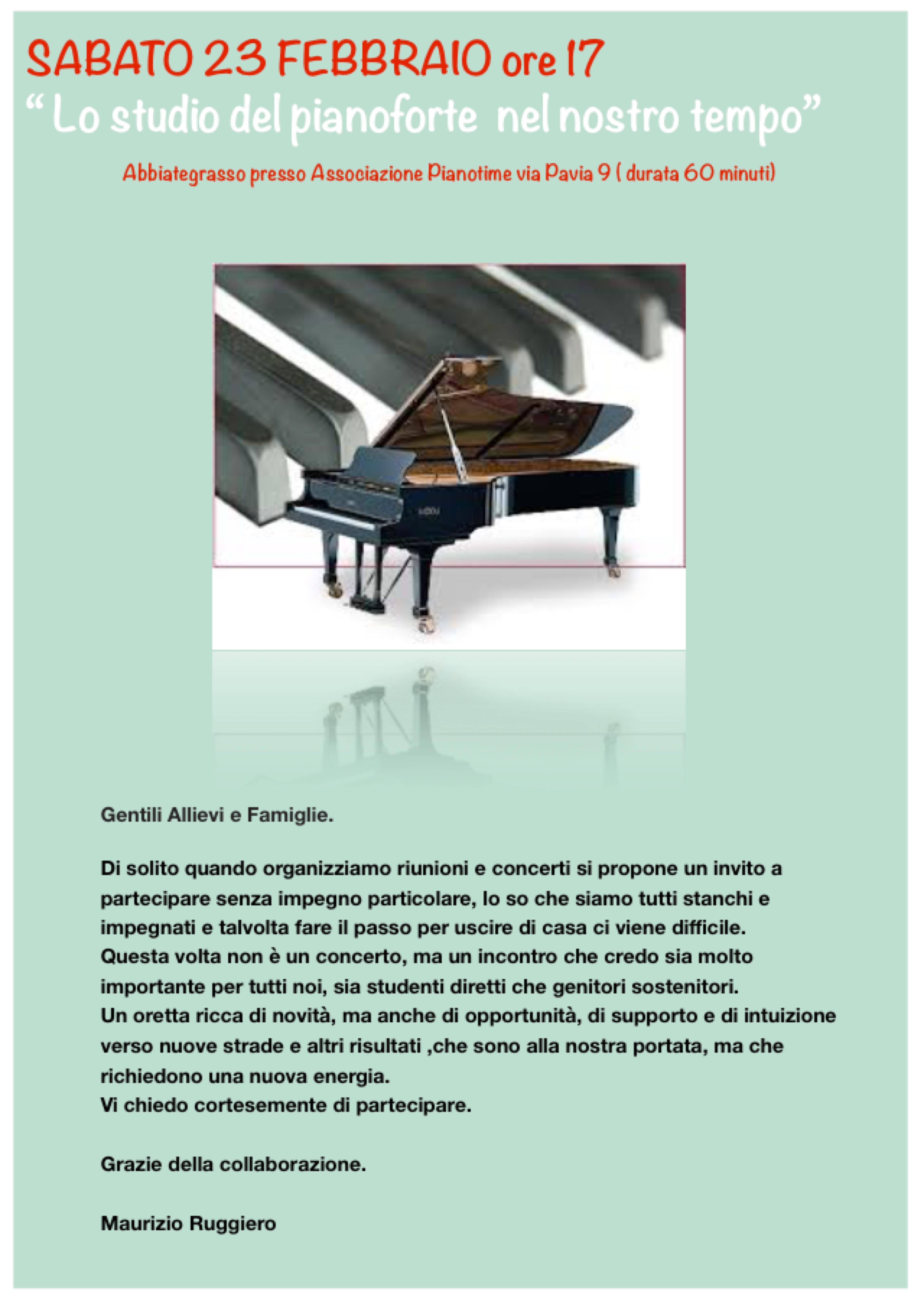 Tra qualche giorno ripartiranno i corsi di Pianoforte nella nostra Associazione, come ogni anno ci sono delle novità: arrivate soprattutto dall’esperienza e dall’osservazione del mondo che cambia, l’apprendimento, i tempi di attenzione, le esigenze e motivazioni personali, sono da sempre in continuo cambiamento. Anche la didattica deve seguire i tempi e non rimanere statica nella tradizione, pur conservando l’alta qualità e la vera funzionalità , adeguandosi ai tempi attuali, per costruire desideri e obiettivi di ciascun iscritto Per me le novità non solo solo l’inserimento di qualche corso rimodellato e ampliato, ma anche il rinnovamento degli entusiasmi, le motivazioni e la voglia di fare qualcosa di bello per tutti, ma anche la creazione di spazi nuovi, di collaborazioni esterne e di esperienze per tutti i partecipanti di alto livello, dove la possibilità di interagire attraverso la musica diventa reale e professionale. La mia presenza sarà sicuramente attiva e seguirà ogni iscritto in prima persona accompagnandolo a tutti i livelli possibili. Vi aspetto quindi sabato 17 dalle ore 11 alle ore 20 in Associazione per tutte le informazioni che vi serviranno o semplicemente per curiosità. Ci saranno due interventi nell’arco della giornata il primo alle ore 11,30 e il secondo alle ore 15,30, dove illustrerò tutti i programmi, i progetti di questa nuova esperienza che sta per ripartire sul binario numero sette. Sette come le note, come i giorni della settimana, come le meraviglie del mondo e come il simbolo della completezza. Che sia di buon auspicio per tutti quanti…a presto