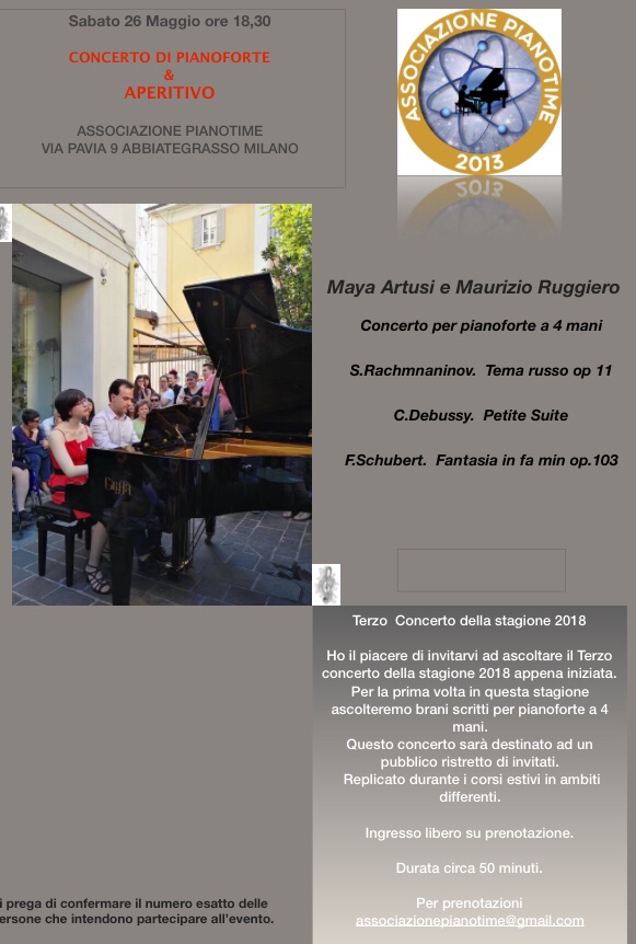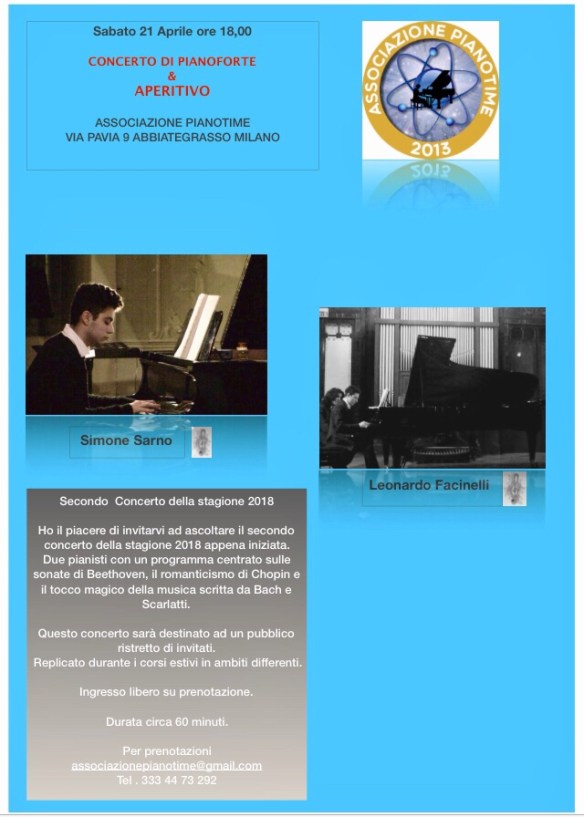 Sabato 21 aprile si terrà il secondo appuntamento con i concerti dei nostri allievi nella saletta dell’Associazione Pianotime. Prenotate il posto se interessati.