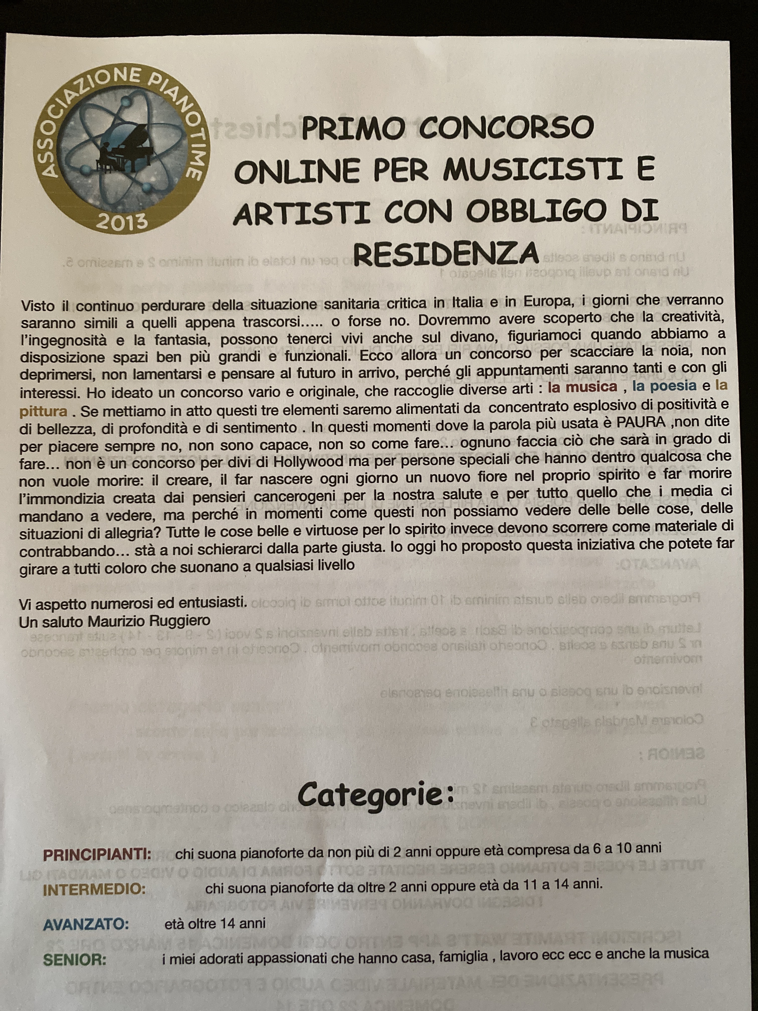 Posso sembrare antipatico o polemico in un momento di difficile, ma è la verità. In tutti i momenti difficili per venirne fuori bisogna partire dalle certezze, che non sono nelle cose e negli oggetti, ma nella nostra natura, allora è giusto non mentire a noi stessi e poi anche agli altri, se abbiamo un problema e non sappiamo risolverlo dobbiamo chiedere e poi provare a vedere se la soluzione è efficace, se lo è dobbiamo aver imparato qualcosa che vale per sempre . Questo è quello che succede agli studenti di pianoforte della mia scuola ai tempi del virus.