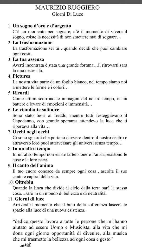 Si chiama giorni di luce come il mio primo lavoro costruito nel lontano 2002 , dove allora non sapevo il vero significato di vivere giorni di luce, ma sentivo di intitolarlo cosi, oggi a 50 anni ho capito che vivere nella luce è la nostra essenza e li dobbiamo restare, ho il desiderio che la mia musica porti speranza, luce e conforto a tutte le persone che l’ascolteranno in silenzio e con la pace nel cuore, chi vorrà trovare un momento della giornata per uscire fuori dalla vita convenzionale. Questo lavoro è dedicato alle persone, a tutti quelli che avranno occasione di sentirlo, sperando che questa nuova musica possa piacere e trasformare in emozioni intense ogni suono che ci entrerà nel cuore. Dedico questo lavoro anche a chi non è più con me, ma che ha lasciato un segno nella mia vita, chi mi ha sempre dato coraggio, voglia di continuare e crescere con valori profondi, chi ha ascoltato i miei momenti di difficoltà , i miei esperimenti e per avermi accompagnato fin qua anche da un mondo invisibile. Grazie !!!